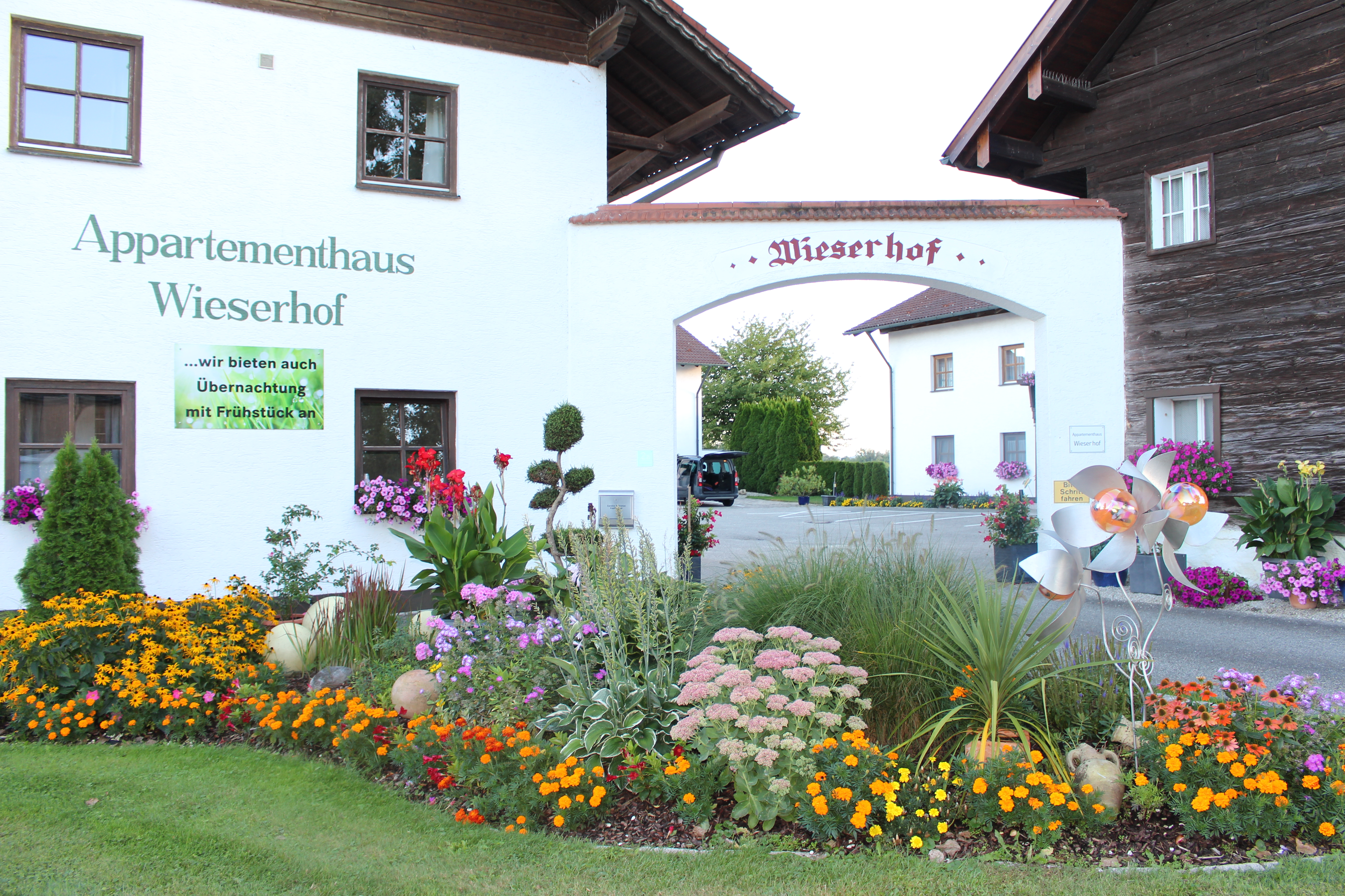 Die Geschichte vom Wieserhof Früher ein Bauernhof, ein so genannter Rottaler Vierseithof, der auch heute noch seine Form erhalten hat. Das alte Holzhaus indem viele Generationen lebten begrüßt seine Gäste bei der Einfahrt durch den Torbogen. Der erste Bürgermeister von Bad Füssing ist hier geboren, er liebte die Natur und seine Heimat, was sich auch in B.F. wieder spiegelt. Der Wieserhof ist eingerahmt in Getreidefelder, die auch heute noch bewirtschaftet werden. Alle Gebäude wurden neu erbaut und manche Gäste sagen, wir haben uns hier ein kleines Paradies erschaffen. Als Gastgeber sind wir sehr dankbar hier auf diesem schönen Fleckchen Erde zu Hause sein zu dürfen. Mit viel Herzensfreude empfangen wir unsere Gäste in unserer Naturidylle, denn auch Sie prägen unsere Geschichte weiter. (heute kein Bauernhof und keine Tiere)